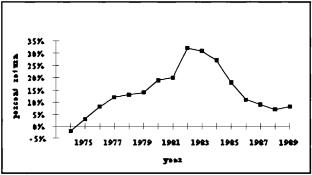 1973年至1975年,恰逢美国刚刚从经济衰退中恢复失业率和收入增长,但这一切都伴随着严重的通货膨胀,并且持续到1980年到达顶峰。在这之后,失业率上升,银行利率处于二战以来的最高水平,生产率增速也开始出现明显下滑,企业投资也在下降。恐惧统治着当时的市场,而信贷危机统治着当时的社会。