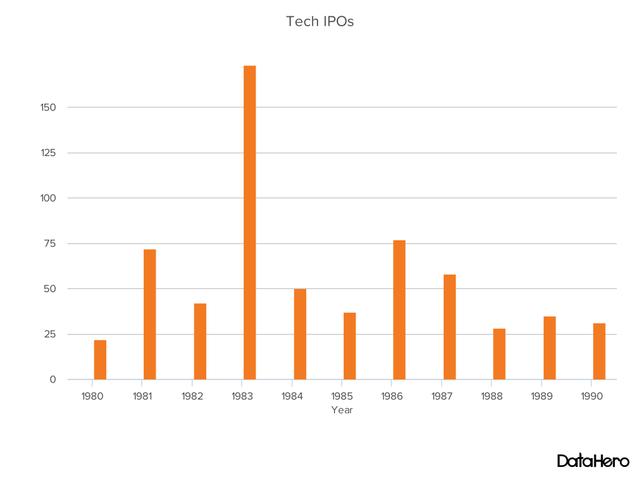 只有1986年的时候稍微好一点,Microsoft, Oracle, Sun, Adobe, and Cypress Semiconductor这些公司利用了这些机会。但IPO的窗口很快又再度被关上,科技股IPO在1983年达到峰值后,未来的二十年可能再也无法回归那个水平。风险投资的回报率也开始出现大幅下滑,从1982年和1983年的大约30%的峰值水平一路下滑道1988年的8%。