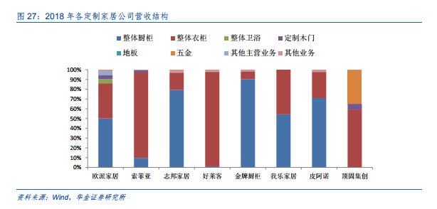 橱衣柜仍是主要收入来源,全屋定制是未来趋势。由于国外流行的整体厨房、壁柜移门的传入,以及厨房、衣柜对房屋空间利用的要求相对严格等,我国定制家具主要集中在定制橱柜、定制衣柜,定制橱柜和定制衣柜渗透率也相对较高。从各大定制家居上市公司 2018 年营收结构来看,虽各定制家居企业业务侧重点有所不同,定制家居企业主要营收来源仍来自定制橱柜和定制衣柜两大业务。木门业务各大企业也在纷纷拓展,但从收入占比来看,仍处于较低水平。