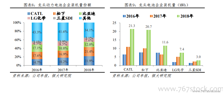 市场集中度不断提高,龙头走向优势凸显。装机量 TOP5 的企业市占率不断提升,由 2016 年的 56.7%上升到 2018 年 65.9%。其中,宁德时代、松下与 LG Chem 市占率提升最快,总装机量增幅最大。2016-2018 年宁德时代装机量 21.3GWh,累计增长233%,市占率 22%,提升 7.2%;松下装机量 20.7GWh,累计增长 171%,市占率 21.4%,提升 3.8%;LG Chem 装机量7.4GWh,累计增长 300%,市占率 7.6%,提升 3.4%。
