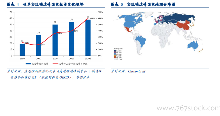 碳达峰是实现碳中和道路上的重要里程碑。截至 2020 年,全球共有 54 个国家实现了碳达峰。其中有一些国家是因为经济衰退实现碳达峰,这部分国家主要集中在前苏联的加盟共和国和东欧计划经济国家。也有一些是因为严格的气候、环境政策和经济发展实现了碳达峰。在世界主要经济体中,德国和俄罗斯于 1990 年实现碳达峰,英国于 1991 年实现碳达峰,美国和加拿大于 2007 年实现碳达峰,东亚的日本和韩国分别于 2013 年和2015 年实现碳达峰。二氧化碳排放达到峰值时,美国的总排放量为 66.5 亿吨二氧化碳当量位居第一,俄罗斯和巴西分别以 39.3 亿吨二氧化碳当量和 34.5 亿吨二氧化碳当量分列二三位。尽管英法德均为发达国家,但因国家体量因素,总排放量并不高。