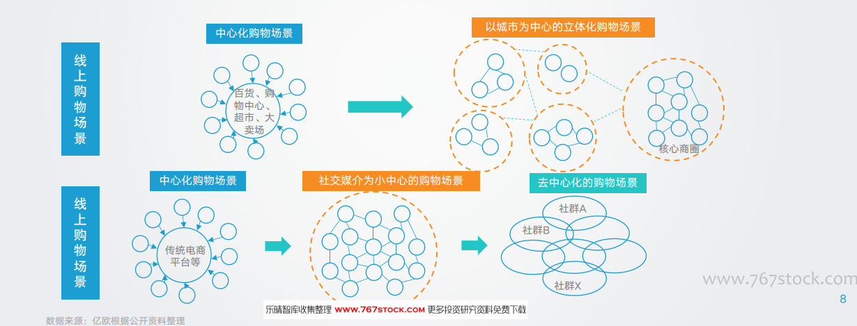 零售业态在空间上的变化呈现出向社区三公里集中的趋势,线上社交零售构筑新的消费渠道。传统实体零售从原来中心化的购物场景,向着以3公里社区为单位的消费场景和10公里核心商圈构成的购物场景过度。原先的中心化购物场景演变成以微信等社交媒介为小中心的购物场景。这一过程中,消费人群在社交和内容的影响下有了初步的结构化聚集,用户之间的社交分享、推荐是以节点型的网络形态呈现,继而形成裂变。人人都是消费者,也是分享者。