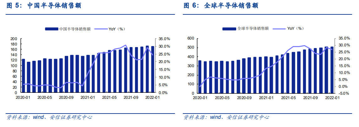 光伏方面, 根据能源局月度调度数据显示,2022 年 1 月全国新增光伏装机容量 7.38GW,同比增长 212%,其中分布式新增约 4.69GW,同比增加 252%,集中式新增装机量 2.68GW,同比增加 160%。中国光伏行业协会名誉董事长王勃华于 2 月 23 日“光伏行业 2021 年发展回顾与 2022 年形势展望线上研讨会”中表示,2021 年我国光伏新增装机量 54.88GW,同比增长 13.9%,其中分布式新增 29.28GW,占比历史上首次突破 50%达到 53.4%,在国内巨大的光伏发电项目储备量推动下,预计 2022 年我国光伏新增装机量将达到 75-90GW,2022-2025 年我国年均新增光伏装机量将达到 83-99GW,到 2025 年我国光伏新增装机量将提升至 90-110GW,而全球 2022-2025 年光伏年均新增装机将达到 232-286GW,到 2025年有望达到 270-330GW。在政策大力支持下,发展日新月异的光伏产业将带动对半导体功率器件的需求。据 Yole 预测,IGBT 市场规模将由 2020 年 54 亿美元增长至 2026 年的 84亿美元,年均复合增长率达到 7.5%,IGBT 市场景气度持续向上。