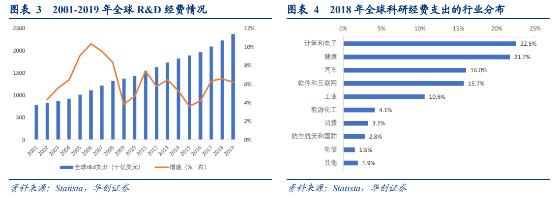 研究与试验发展经费是科学服务业的重要支撑,当前全球研发支出已超 2.3 万亿美元。根据 R&D World 的数据,2019 年全球 R&D 支出超 2.37 万亿美元,占全球GDP 的 1.72%,2001 年-2019 年年均复合增速超 6%,其中研发经费支出主要集中在北美、欧洲和亚洲。2019 年,研发经费支出最高的 10 个国家 R&D 占全球总额的 78%,美国和中国是全球研发经费支出的主要贡献者,占比分别为 25%和 22%。