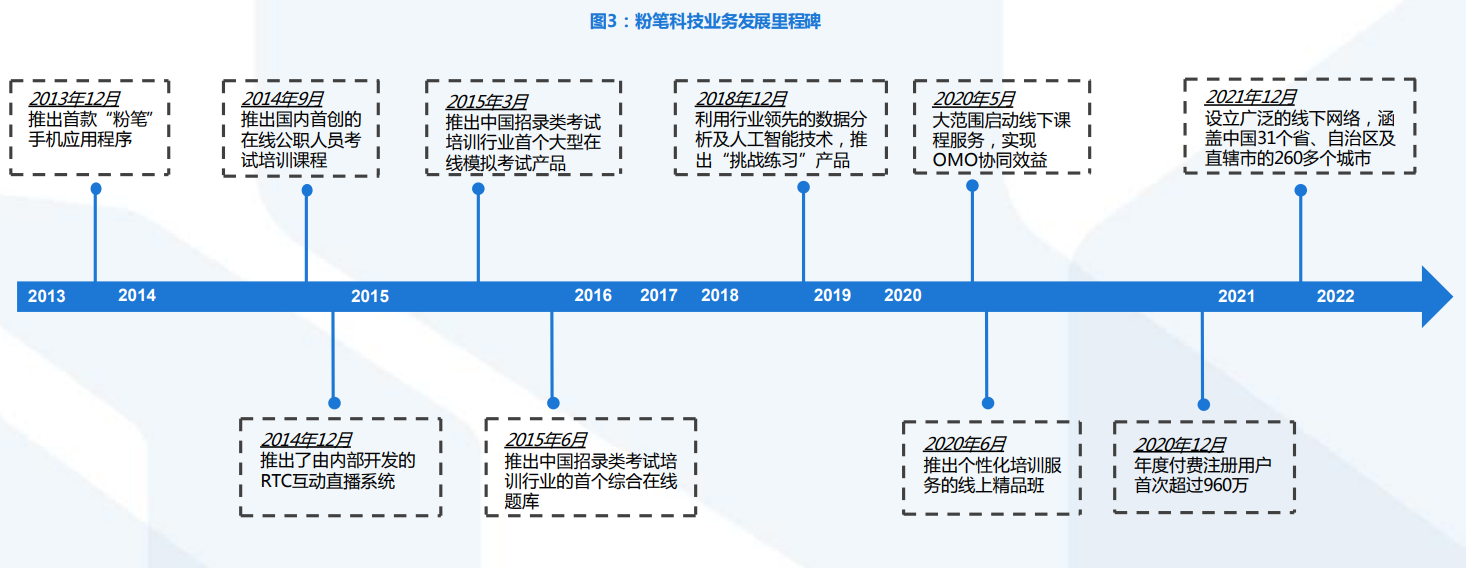 中国在线职业考培先驱者,OMO提升协同与运营效率。公司凭借高质量的直播/录播在线培训课程、在线自学资料及工具,在用户中快速建立线上影响力及品牌;2020年5月大范围推出线下培训,扩展目标市场及服务更广泛的学员群体。截至2021年12月31日,线上平台积累逾3,770万名注册用户及4,530万线上付费人次,线下业务覆盖中国31个省、自治区及直辖市的260多个城市,累计超过170万线下付费人次。