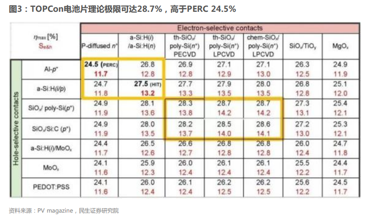 特殊表面钝化层为TOPCon带来效率优势。TOPCon电池采用极薄的SiO2钝化层,外侧使用100nm的N型Poly-Si背场,增大内建电场,促进载流子分离,提高转化效率。但仍使用了SiNx等导电性差的反射层,电极需要高温烧穿该层与Poly-Si接触,依旧会有较高的界面复合,对电池效率形成一定限制。目前产线效率约24.6%,预期提升至25%左右。单面钝化理论极限效率为24.9%,双面钝化理论极限效率为28.7%,但前钝化层生产工艺复杂,未能得到有效突破。