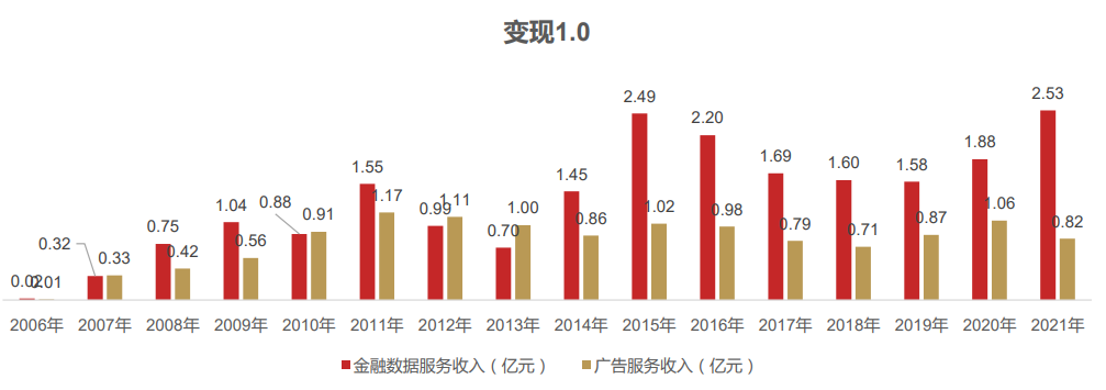 自2011年广告业务收入突破1亿元之后,公司广告业务收入近10年均在1亿左右收入体量浮动。可以看到,广告收入与用户总量无关。原因是东财广告业务主要是互联网广告,主要与宏观经济大盘相关(而同花顺主要是给券商导流开户等)。此外,随着互联网广告行业竞争加剧,公司广告业务毛利率持续走低,2021年毛利率为-14%。和用户总量关系不大,东财月活从2014年的200万增至2021年的2000万,但广告业务收入并未明显增长。