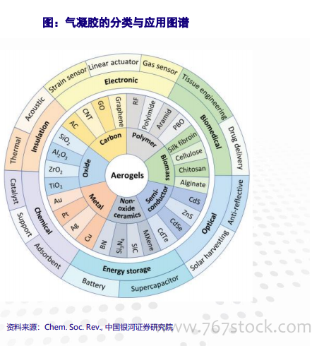 气凝胶被称为“蓝烟”,改变世界的神奇材料。1931年气凝胶正式问世,是目前已知导热系数最低、密度最低的固体材料,因轻若薄雾颜色泛蓝,又被称为“蓝烟”;具有超长的使用寿命、超强的隔热性能、超高的耐火性能等,被誉为“改变世界的神奇材料”。 常规气凝胶比表面积~700m2/g,孔隙率95%-99.8%,均匀分布的纳米级孔隙结构几乎隔绝热传导和热对流,赋予其远胜其他传统材料的隔热性能,导热率最低可达0.012-0.016 W/(m·K),只相当于空气的1/2。气凝胶有很多类型,大多密度不会超过3mg/cm3;如,全碳气凝胶密度更是低至0.16mg/cm3,仅为常温常压下空气密度1/6。