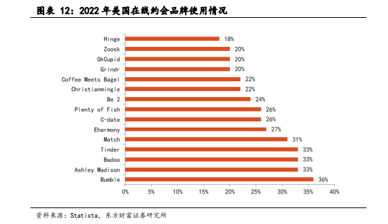 陌生人社交领域竞争激烈,难以形成一家独大。全球在线约会龙头 MatchGroup 曾表示在线约会行业有三大特征:1)渗透率低;2)并非赢家通吃;3)用户平均同时使用至少 3 款类似产品。根据 Statista 调查数据显示,2022 年美国在线约会品牌使用中大量产品保持着 30%左右的渗透率,其中 Bumble 36%、Tiner 33%等。事实上,Match Group 也践行着多产品矩阵的策略,旗下包括Tinder、Match、OkCupid、Hinge 等数十款在线约会应用。