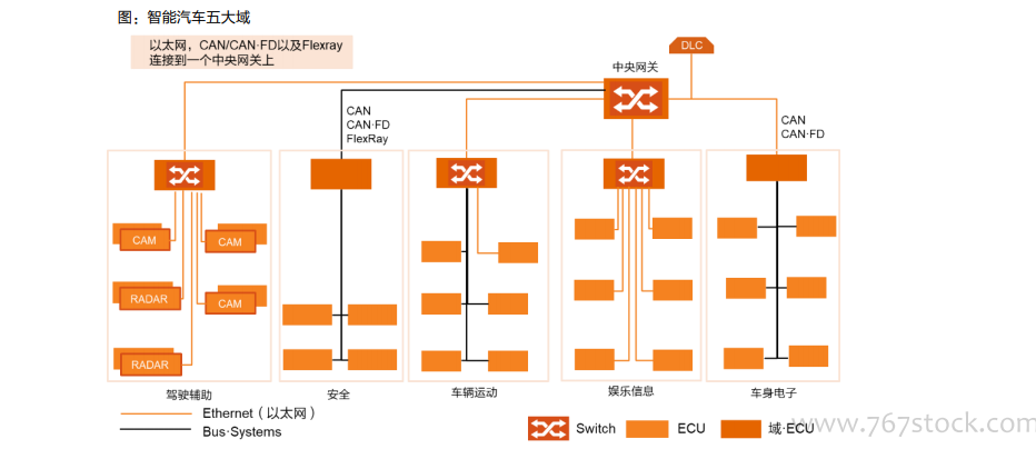 智能汽车五大DCU,座舱域、驾驶域是智能化关键。博世、大陆等Tier1 将当前汽车 E/E 架构按功能划分为动力域(安全)、底盘域(车辆运动)、座舱域(信息娱乐)、自动驾驶域(辅助驾驶)和车身域(车身电子)五大区域。每个区域对应相应的域控制器,利用处理能力更强的多核CPU/GPU芯片相对集中控制每个域,最后再通过 CAN/LIN 等通讯方式连接至主干线甚至托管至云端,从而实现整车信息数据的交互。