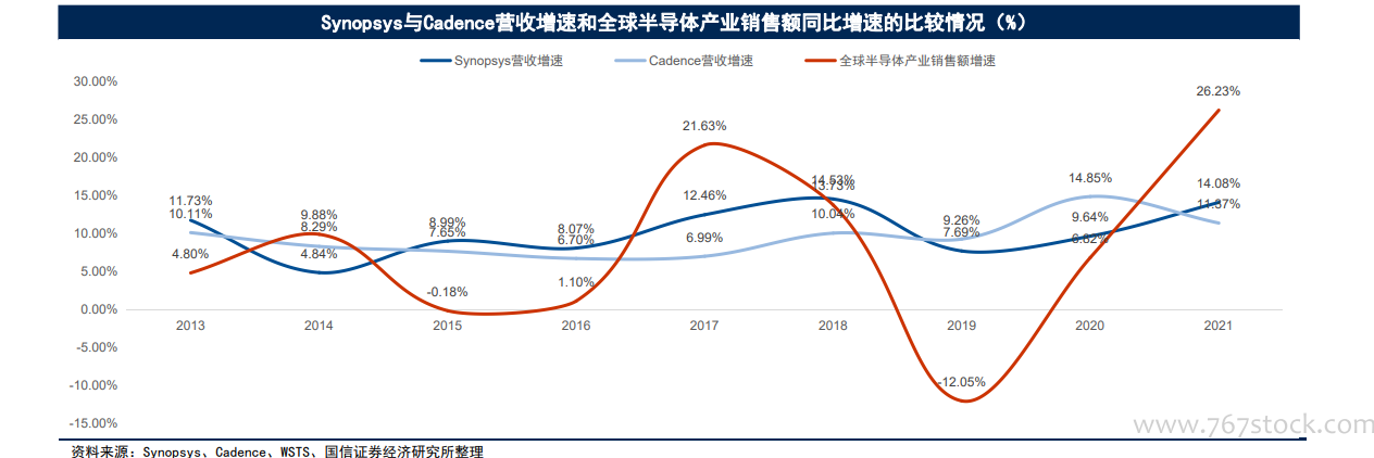 EDA公司的业绩增长具有较强的逆周期性。由于Mentor Graphics被西门子收购后不再披露财务数据,因此以Synopsys与Cadence为例。在营收方面,从2013财年到2021财年,Synopsys的营收从19.6亿美元增长到42.0亿美元,同期Cadence营收从14.6亿美元增长到29.9亿美元,从营收增速上能够看出,两家公司的业绩增速较为稳定,即便是在全球半导体产业销售增速同比下降的年份,两家公司的业绩依旧保持强劲的增长动力。这主要是因为,EDA软件的商业模式以固定期限授权,其收入连续性较好,不会因全球半导体产业景气度的变化而发生大幅波动。