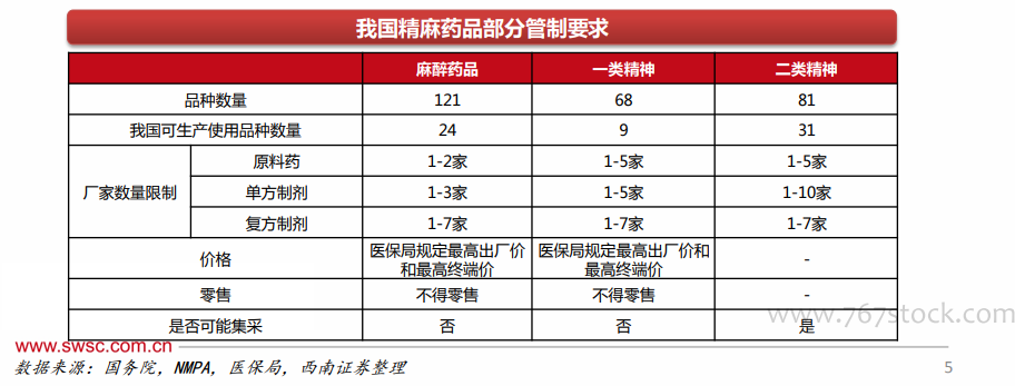根据监管分类,可分为麻醉药品、一类精神药品和二类精神药品,有严格的行政管制。麻醉镇痛药中大多属于国家管制麻醉,麻醉镇静药中部分属于国家精神类管制。