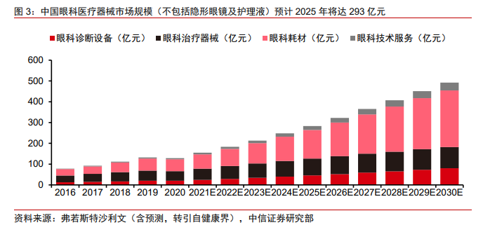 眼科产业链包括眼科服务、眼科器械和眼科治疗药物三大领域。眼科服务市场可分为公立眼科和民营眼科两大阵营;眼科器械市场则包括眼外科(可分为眼科诊断设备、眼科治疗设备、眼科耗材及眼科技术服务等板块)和视力保健两大领域;而眼科治疗药物市场目前主要集中在抗炎抗感染药物、抗 VEGF 药物、干眼症药物三大领域。