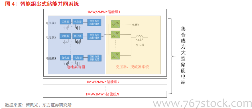 集中式:低压大功率升压式集中并网储能系统,电池多簇并联后与 PCS 相连,PCS 追求大功率、高效率,目前在推广 1500V 的方案。