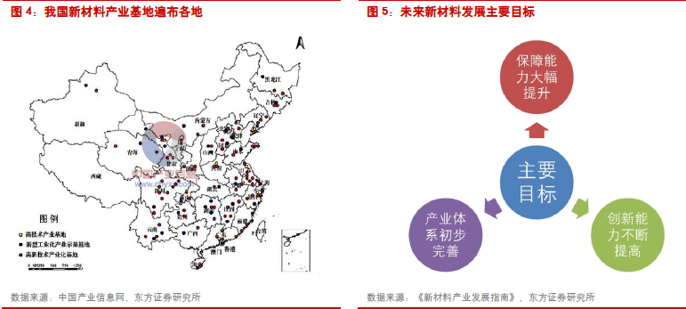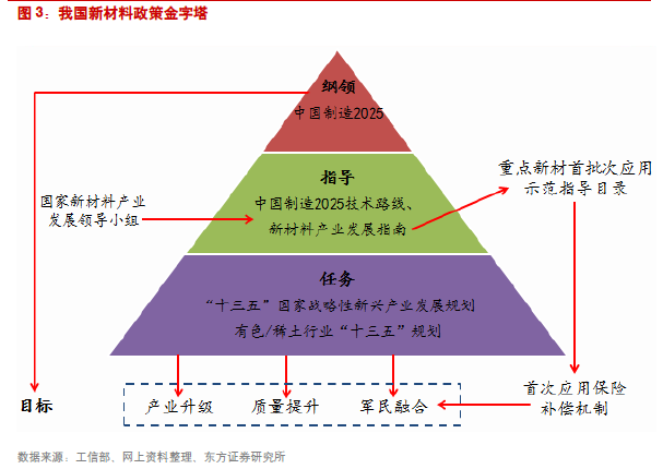 中国新材料政策金字塔构筑完成,全产业链、全方位指导。我国高度重视新材料产业发展,目前通过纲领性文件、指导性文件、规划发展目标与任务等构筑起新材料发展政策金字塔,予以全产业链、全方位的指导。其中纲领文件主要为《中国制造2025》,指导性文件包括《中国制造2025》重点领域技术路线图、《新材料产业发展指南》,发展任务与目标相关文件包括《“十三五”国家战略性新兴产业发展规划》、《有色金属行业发展规划(2016-2020年)》、《稀土行业发展规划(2016-2020 年)》等。此外,我国还于2016 年12 月首次成立国家新材料产业发展领导小组,由国务院副总理马凯担任组长,国家大力振兴新材料产业的决心得到充分体现。