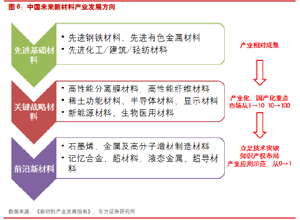 制造业升级呼吁关键战略材料产业化和规模化应用。《新材料产业发展指南》明确了新材料未来三大发展方向,即先进基础材料、关键战略材料和前沿新材料。目前来看,我国在先进基础材料背后的钢铁、化工、纺织、建筑等领域已发展较为成熟,2016 年钢产量占据全球50%以上,铝合金产量全球占比也超过30%,全球纺织第一大国地位继续保持,化工领域也面临产能过剩局面,可以说我国在基础原材料(钢铁、纺织、化工)领域已率先完成了产业化和国产化,未来的发展方向更多在于从成熟走向不断优化。而在前沿新材料领域,基础研究和原始创新仍是下一阶段重点,石墨烯、记忆合金一类的高性能材料仍在积极探索产业化方向,更关注下游应用从0 到1 的突破,因此整个市场空间的爆发可能仍需要向后推迟。