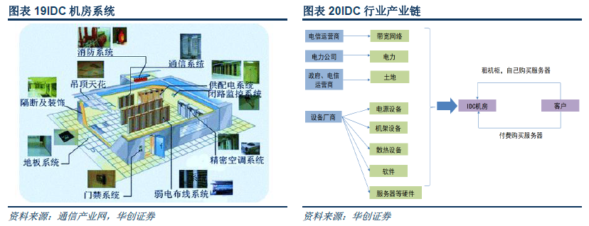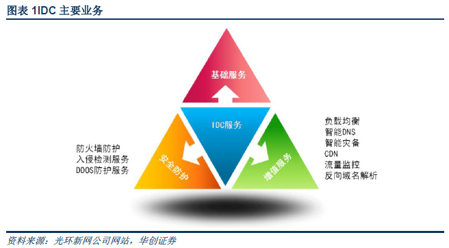 类型上第三方批发型IDC厂商成为主流,业务属性上增值服务收入占比不断提升。互联网数据中心(InternetData Center)简称IDC,作为数据存储中心和数据交换中心,是大数据时代重要的基础设施,是承载云计算与未来业务发展的重要载体。IDC的基础服务包括主机托管(机位、机架、机柜、机房出租)和管理服务(系统配置、数据备份、故障排除服务等),在此基础上提供安全防护(防火墙防护、入侵检测等)和增值服务(负载均衡、智能DNS、流量监控等)。