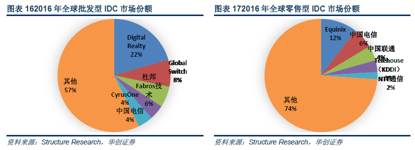 第三方IDC服务商可以区分为批发型IDC服务商和零售型IDC服务商,批发型IDC服务商同时也是零售型IDC服务商的供应商。零售型IDC服务商通过自建IDC或者租用基础电信运营商或批发型IDC服务商的IDC为各类客户提供专业的IDC服务,通常是先行建造标准化的IDC并配置带宽网络,基于单个标准机柜的方式出售,提供标准的机柜托管服务及互联网接入服务,代表企业为 Equinix、光环新网等。批发型IDC服务商主要通过自建大型IDC的方式向客户提供IDC服务,客户包括基础电信运营商、零售型IDC服务商、IaaS服务商、IT外包服务商/集成商以及各类最终用户,批发型IDC提供的IDC通常按机房模块单元出租,一般不提供互联网接入服务,代表企业为 Digital Realty Trust、Global Switch、数据港等。
