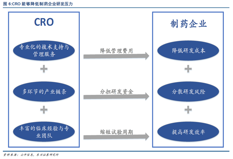 提高效率分散风险,CRO 应运而生。制药企业要在管理愈加严格、竞争愈加激烈的环境中求得生存与发展,就必须尽力缩短药物研发时间且同时控制成本并减少失败的风险。恰逢其时,CRO 公司应运而生,能够帮助制药企业降低研发成本、降低研发风险和提高研发效率,使整个制药领域实现社会分工专业化、风险平均化。