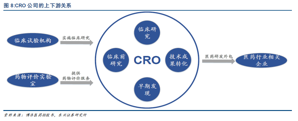 从产业链来看:上下游合作粘性不断增加。在药物研发产业链中,CRO 公司的上游是具备药物临床试验资格(GCP)的医疗机构与具备药物非临床研究质量管理规范(GLP)的药物评价实验室,下游主要为包括制药企业、药品经营企业、医疗器械企业、医疗保健品企业和其他研究机构在内的医药行业相关企业。凭借自身的资源优势与渠道优势,CRO 公司与上下游之间的合作粘性不断强化,逐步成为医药研发产业链中不可缺少的环节。
