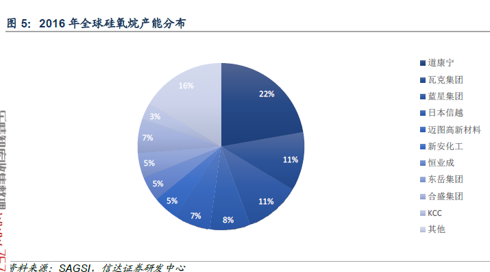 有机硅全球——海外产能基本稳定,产能增长主要源自中国。2016 年,全球聚硅氧烷产能244 万吨/年,产量约185 万吨,整体开工率75.9%,主要聚硅氧烷生产商有美国道康宁、德国瓦克化学、中国蓝星、日本信越、美国迈图和中国新安,2016 年6家企业聚硅氧烷产能合计156.5 万吨/年,占全球总产能的64.1%。
