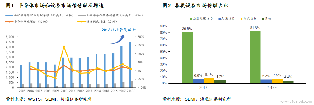 半导体产业整体景气回升,设备市场波动更敏感。半导体产业作为一个非常成熟的行业,具备较为明显的周期性。从半导体市场销售额的角度来看,2005 年以来,全球半导体产业在2009,2012 和2016 年均开启了新一轮的景气周期。根据WSTS的数据,2017 年全球销售额首次超过4000 亿美元大关,同比增长22%。考虑到数据中心、人工智能、汽车电子、无人驾驶等主题对半导体的需求持续增长,2018 年全球主要行业协会继续维持行业较高增速的判断。