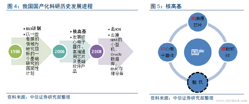 我国信息领域核心技术已有20 多年的积累。早在1986 年,我国开始了 “863 计划”(高技术研究发展计划),旨在提高我国自主创新能力,坚持战略性、前沿性和前瞻性。2006年,国务院发布的《国家中长期科学和技术发展规划纲要(2006-2020 年)》中“核高基”与载人航天、探月工程并列的16 个重大科技专项之一。