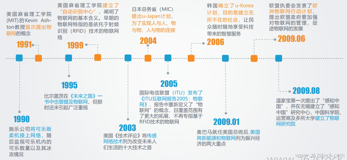 物联网概念的提出与转变、物联网与传感网、泛在网的区别与联系。物联网(Internet of Things,简称IoT),主要是通过传感器、通信模块以及芯片等感知设备将物体进行联网。国内外普遍认为,1999年麻省理工学院的Ashton教授在研究RFID时,第一次提出了物联网的概念。随着时间的发展,2005年国际电信联盟(ITU)发布的《ITU互联网报告2005:物联网》报告中,又重新定义了物联网的意义和范畴。
