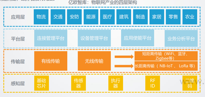 物联网产业的四层架构,根据实际发展情况,将应用层分为了十大领域。本报告将物联网的技术架构分为四层,分别为感知层、传输层、平台层和应用层。其中,感知层是物联网的底层,是物联网应用和发展的基础。利用RFID技术、传感等技术,实现对物理世界的智能感知、识别及控制等。物联网的传输层分为有线传输和无线传输,无线传输可按距离分为短距离传输和长距离传输,本报告主要讲述无线传输。物联网的平台层分为四大平台,分别为连接管理平台、设备管理平台、应用使能平台和业务分析平台。平台层用于数据的分析与处理,后应用于各个行业。亿欧智库根据实际发展状况,将物联网应用层分为十大领域,分别为物流、交通、安防、能源、医疗、建筑、制造、家居、零售以及农业,本报告旨在将各领域如何应用物联网技术阐述清楚,故排名没有先后。