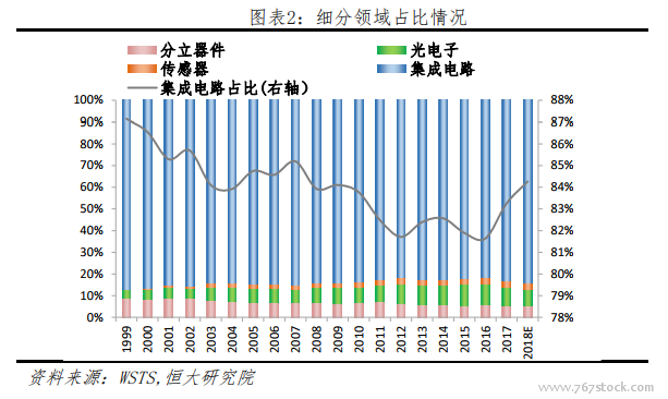 大规模兼并收购带来细分领域的龙头效应,议价能力增强。为了保障企业技术水平、研发进度领先,并拥有一定的市场份额,半导体自2000 年开始进行一定规模的兼并收购,整体交易金额在 2015 年达至顶峰为 1073 亿美金。大量高频的行业并购降低制造商与供应商数量的同时,使“强者越强”。而 2017 年的并购行为放缓也侧面说明,行业的成熟令各自领域的龙头效应明显,更多的并购已无法带来更好的边际效益。
