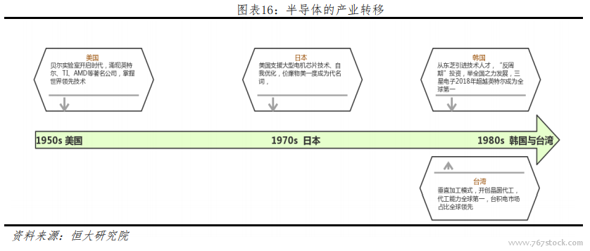 从历史进程看,全球范围完成两次明显的产业转移:第一次,十九世纪 70 年代从美国转向日本。十九世纪 50 年代,晶体管诞生于美国,后续发明影响行业的革命性芯片与商业应用,例如英特尔 4004、英特尔 8088、IBM 个人计算机等。出于经济与政治因素考虑,70 年代向日本提供技术与设备支持,产业转向日本,日本半导体一度跃至世界第一。为了抵制日本发展夺回半导体行业话语权,美国开始向韩国台湾等地提供支持,第二次,产业从 80 年代开始转向韩国与台湾。为了降低设备、人力等成本,目前,产业逐渐转向中国大陆。是什么支持这些国家与地区半导体行业发展如此蓬勃?他们又是如何抓住机遇?我们后续根据国家一一分析。