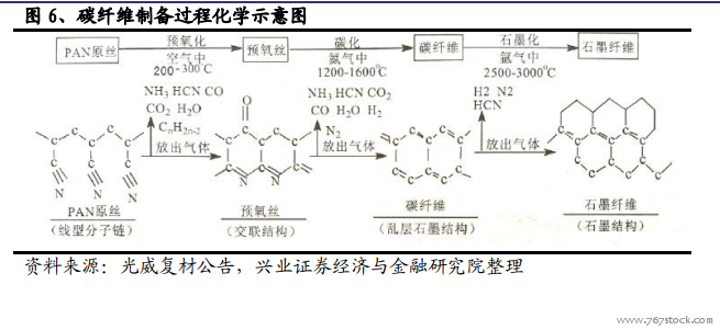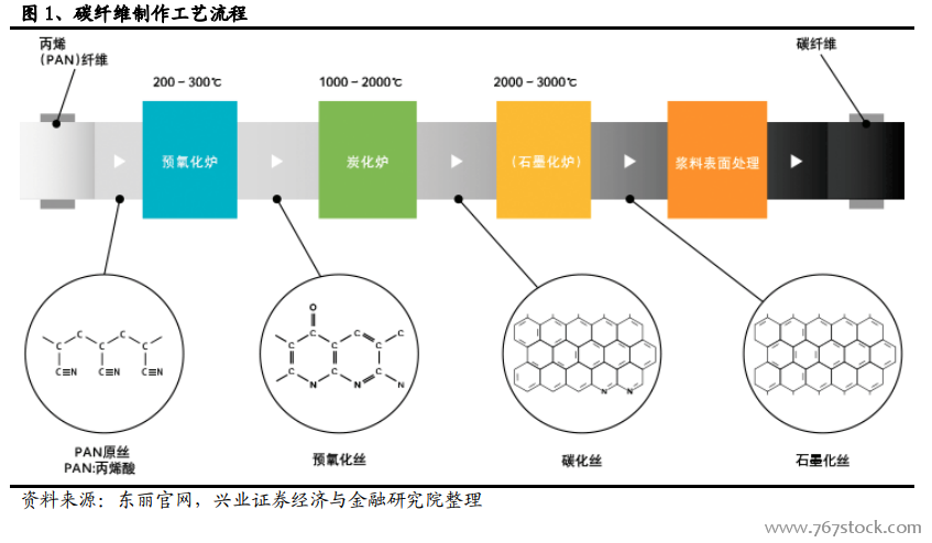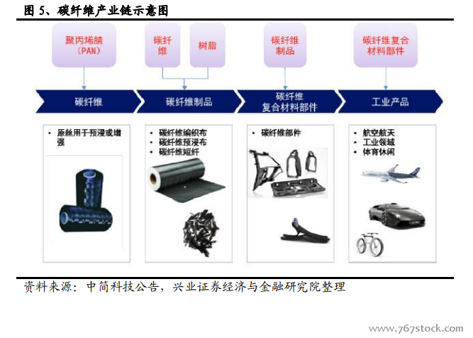 国际碳纤维发展概况。国际上 PAN 基碳纤维的生产起步于 20 世纪 50 年代末,经过 70~80 年代的稳定发展,90 年代的飞速发展,到 21 世纪初其生产工艺技术已逐步成熟。行业发展初期,碳纤维主要用于军工和宇航,经过 50 余年的发展,现正在向工业领域和普通民用领域延伸。