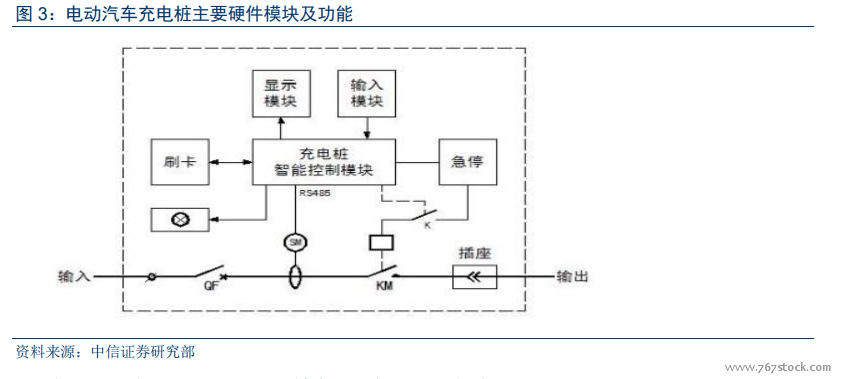 交流桩的硬件系统主要包括主控单元、监控保护单元、数字电表、通信模块、人机交互系统等。其中,智能控制模块为充电桩核心部件,基于电池管理系统(BMS)负责启动、运行、监控、关闭充电行为,并通过端口将数据传输给对外显示模块、后台管理系统;监控保护单元负责检测系统状态,如输入输出电压、电流、通断状态,并在异常情况下提供切断电源、限压限流,保护汽车和充电桩等保护措施;人机交互系统包括显示模块、输入模块和 IC卡读写等,负责实现系统界面、充电设定、IC 卡读写读卡器、密钥管理、加密传输、账户识别、充值扣费等任务。