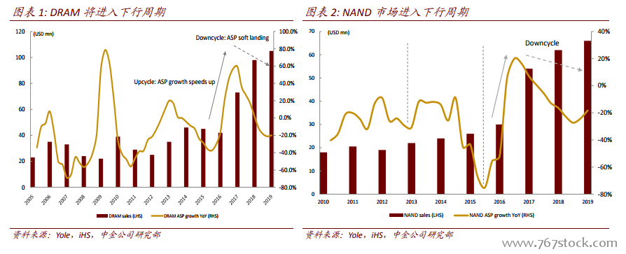 全球存储器市场是一个千亿美金量级的市场,2017 年收入规模达到 1,319 亿美元,占半导体行业收入的 30.1%,主要驱动力包括智能手机和数据中心服务器。存储器市场与整个半导体行业一致,景气度随供求关系呈周期性变化。目前,在智能手机出货量放缓后,AI、5G 等新应用还未能对存储器需求形成规模性刺激,大容量 NAND 今年跌幅明显,DRAM方面,主流 DDR4 价格产品已经开始松动。未来存储颗粒单价将呈下跌趋势,行业下行周期开始。