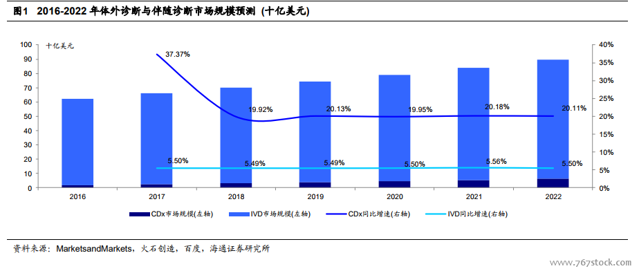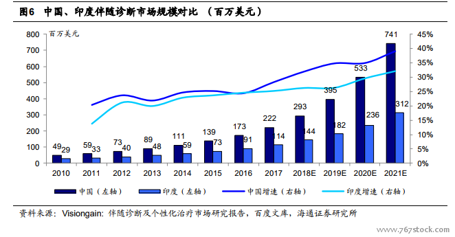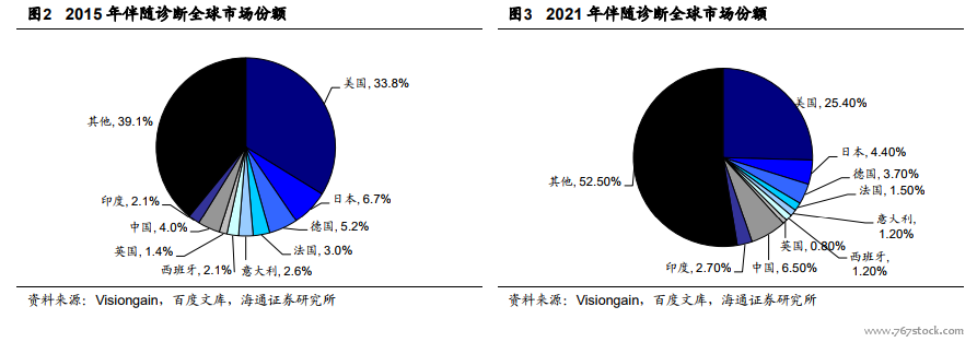伴随诊断欧美市场:技术更新迭代助力行业发展。伴随诊断作为体外诊断的一个细分行业,最早的诊断出现在 20 世纪 80 年代,当时医药企业观望情绪较重,行业发展缓慢。随着伴随诊断在罗氏公司(Roche)生产的治疗乳腺癌的 Herceptin®(赫赛汀) (通用名:trastuzumab, 曲妥珠单抗)和诺华公司(Novartis)生产的治疗白血病的 Gleevec®(格列卫)(通用名:imatinib,伊马替尼)两种药的商业成功后,这个领域逐步发展起来。各类单抗及小分子靶向药均开始推出伴随诊断产品,行业开始进入快速发展期。