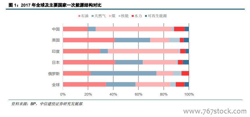 我国能源消费结构与发达国家相比仍有较大差异。中国具有“富煤,贫油,少气”的资源禀赋特征,2017年煤炭在我国一次能源消费中的占比高达 60.4%,石油占比为 19.4%,天然气占比仅为 6.0%。与发达国家同期相比,我国煤炭消费比例仍然过高,天然气消费比例则偏低。2017 年天然气在一次能源消费中的占比,世界平均水平为 24%,美国为 32%,俄罗斯为 52%;加拿大、法国、意大利、英国和瑞士的原煤消耗维持在 10%以下的水平,大多数国家中天然气的消费比例均不低于 15%。