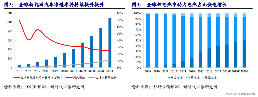 全球新能源乘用车销量及渗透率快速提升。随着电动汽车和混合动力汽车的技术成熟,全球新能源汽车的规模快速增长,未来新能源汽车相对于传统燃油车的成本优势有望建立。根据 BNEF 的预测,到 2025 年全球新能源乘用车的销量有望增长至 1100 万辆,占汽车销量的比例达 11%。2025 年后,传统燃油车的销量逐渐下滑,到2030 年新能源乘用车将进一步增长至 3000万辆,占汽车销量的比例达28%。
