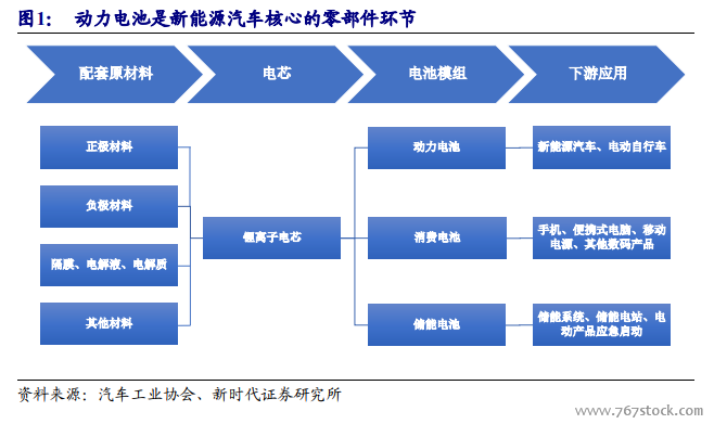动力电池是新能源汽车产业链关键环节。锂电池上游主要是正极、负极材料,隔膜、电解液、电解质以及外壳包装等其他材料。中游环节是由原材料加工制成锂离子电芯,并成组为电池包。电池分为动力电池、消费电池、储能电池三大类,应用于不同的下游领域,动力电池是新能源汽车核心的零部件环节。