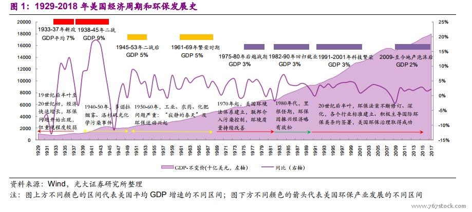 工业及城镇化进程与环保投资变化。从历史进程看,美国的工业化起步晚于英、法,但发展速度较快:以电力工业为标志,19 世纪末期美国完成了近代工业化;而石油、煤炭工业的发展为美国制造业发展奠定了基础。“一战”后,美国钢铁、化工、汽车、电气、建筑、等行业位居世界第一;“二战”后“罗斯福新政”强化了美国工业世界领先地位。伴随着工业发展的则是不断加重的污染,这些重工业污染治理的存量问题则是环保法律政策完善后首当其冲需要解决的,也是前期环保治理新增投资的作用点。