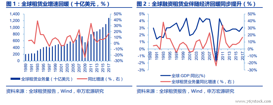 融资租赁受宏观经济影响呈现高度相关性,全球租赁市场受次贷危机影响后近年来增速回暖。1997 年亚洲金融危机,增速受影响小幅下滑;2007 年全球金融危机爆发,使得全球各地区的租赁业规模出现负增长,08-09 年全球租赁业务量分别同比下降 6.1%及23.9%;近年来伴随整体经济逐步复苏,租赁业务 2017 年增速回复至 16.6%。