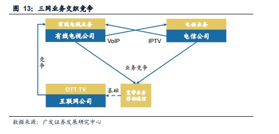 资本和市场主导下三网融合推进。和我国以行政力量推进各国有公司的整合不同,美国的有线电视和电信企业多为私营企业,融合过程中资本主导,三网融通可以认为是开放竞争以后市场行为的自然产物。融合方式包括直接接入对方业务市场以及产业融合两种途径,如有线电视行业巨头康卡斯特全面开展三重播放(电视、电话、互联网)和四重播放(电视、电话、互联网、移动通信)业务,直接进入电信市场。产业融合下,电信公司(包括长途公司和本地公司)和有线电视公司、互联网公司等通过资产重组和并购,实现技术、资本和市场的互动前进,如1996年的《联邦通信法》颁布后,AT&T收购当时的第二大有线电视公司TCI。
