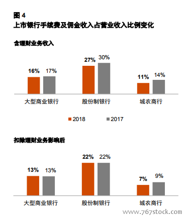 银行卡手续费向好,理财业务趋降。2018年各类银行的手续费及佣金净收入较2017年相比,大型商业银行整体实现增长,股份制商业银行和城农商行整体均出现了下降。