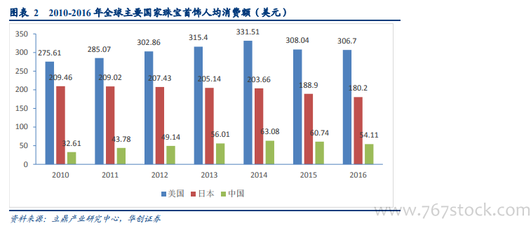 美国市场规模近 800 亿美元,市场分散。2010-2014 年间美国的珠宝首饰消费需求无论是总额还是人均额都不断攀升,2015 年行业遇冷,消费需求出现拐点。而投资需求自 2009 年起大体维持稳定增长,2017 年已达 769 亿美元。美国珠宝市场集中度较低,2015 年 CR5 仅 16.4%。2008-2015 年间美国珠宝行业集中度持续提升,品牌形象低、规模小、经营不善的小珠宝品牌逐步被挤出行业。