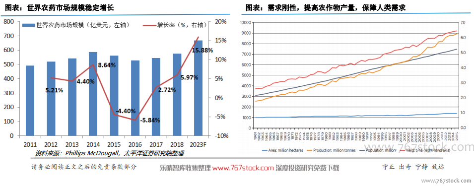 农药需求刚性,提高农作物产量,保障人类需求,其市场规模持续增长。2018年全球农药市场(农作物)规模575.61亿美元(+6.0%),非农作物用农药市场规模73.11亿美元(+3.1%)。预计2023年用于农作物的农药需求667.03亿美元,2018-2023年CAGR达3%。分产品:除草剂246.1亿美元(增长5.9%,占比42.7%)、杀菌剂163.2亿美元(增长4.7%,占比28.4%)、杀虫剂145.5亿美元(增长7.6%,占比25.3%,但过去五年增速仅为0.2%,2018年主要产品价格上涨、渠道库存少刺激,棉花虫害等)。分地区:亚太(增长7.2%,占比30.4%)、拉丁美洲(增长11.1%,占比24.7%)、欧洲(下降3%,占比20.8%)占据主要市场。