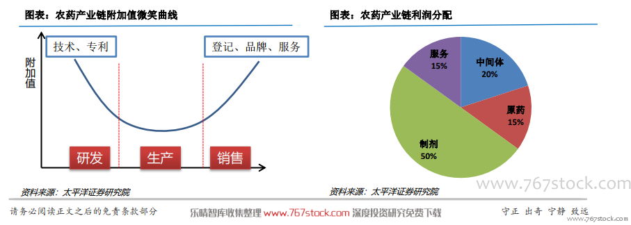 原药:对研发能力、生产技术、生产工艺、环保和安全生产的要求较高,固定资产投资规模大,一般不能直接施用,其核心技术为农药有效成分化合物合成技术。制剂:是在原药的基础上,加上分散剂和助溶剂等辅料,经研制、复配、加工、生产出制剂产品,直接应用到农业生产,与农作物的产量、质量、环境保护、食品安全、生态稳定有密切关系。农药制剂主要以植物保护技术和生物测定为基础,以界面化学技术及工艺为研发和制造手段,生产过程对环境和安全的影响较小。据统计,农药产业链利润分配中,制剂占据50%、中间体20%、原药15%、服务15%,微笑曲线明显。跨国公司通过掌握原创原药,掌控大量制剂登记与销售渠道占据食物链上层,国内企业主要为其做中间体、原药加工(过专利期),全球约60%的原药来自中国,制剂生产较少。中国化工集团吸收合并安道麦、先正达后,原有竞争格局有望逐渐发生改变。
