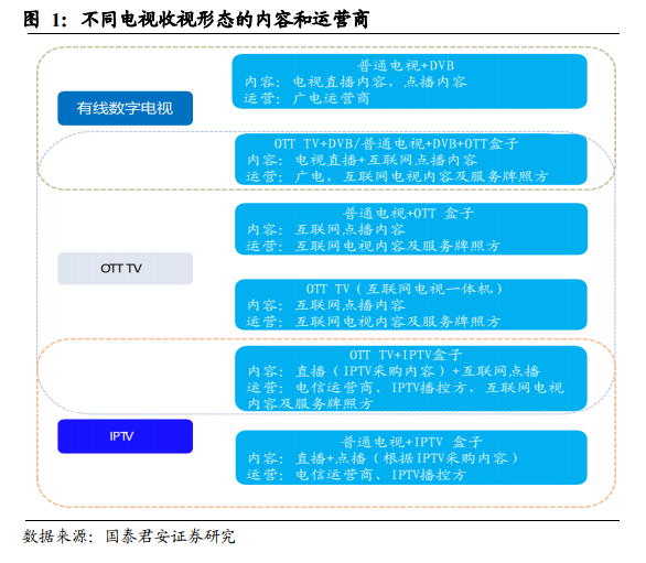电视收视形态内容及发展。我国电视收视的三种形态:有线电视、IPTV 及 OTTTV,传输渠道分别为广电网络、电信运营商网络及互联网;且在硬件设备、运营主体、内容、业务形态及政策管控环境上均有不同。在前端设备上,普通电视或互联网电视与不同机顶盒组合,可实现不同的电视收视服务形态。