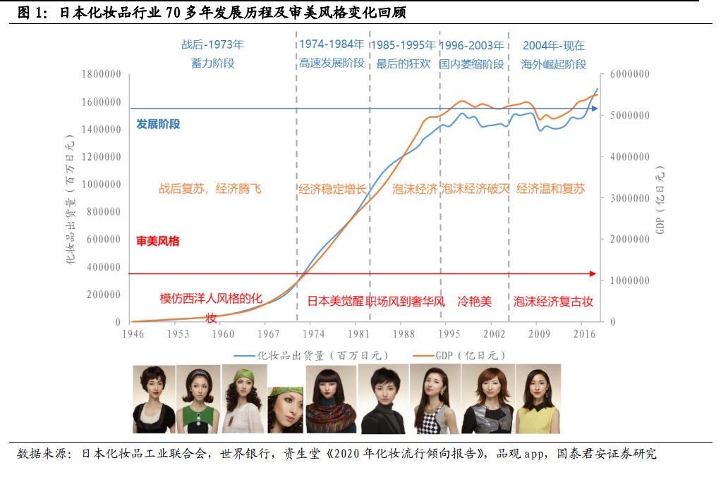 消费结构升级推动化妆品行业高速发展,1985 年日本化妆品行业出货额达 1.1 万亿日元。1956-1973 年经济高速增长对消费带来的拉动主要体现在居民的基本物质需求得到了满足,而 1974-1985 年期间家庭收入持续增长驱动的消费结构开始转型升级,体现为交通通信、教育、娱乐、其他等更高层次的消费需求占比极速题提升。而化妆品消费正是经济发展到一定阶段,人们满足马斯洛基本需求后,开始追求美丽而产生的需求。1974-1984 年,日本食品消费占比继续下降了 4.8 个 pct,教育、娱乐和其他消费占比分别提升了 1.6/0.3/1.8 个 pct。与此同时化妆品出货额达到 1.1 万亿日元,10 年复合增速 7.9%。
