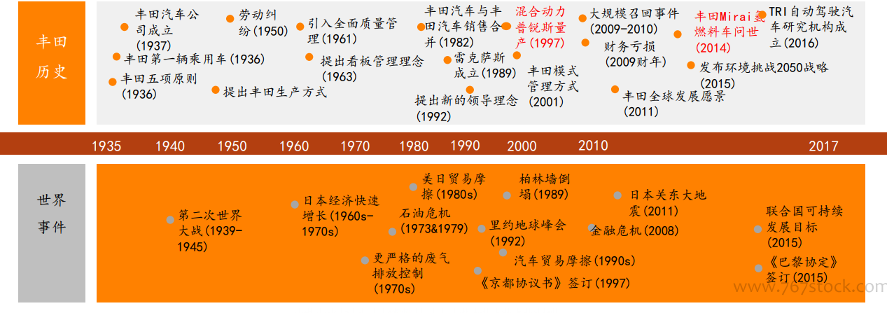 丰田80年,居安思危,历次关键转型成功。丰田成立最初从事纺织行业,1933年成立汽车事业部,并确立了“低成本、大规模、高质量”生产家用汽车的方针。二战结束之后,日本大力发展自主汽车品牌,丰田依靠技术研发、生产管理优势成功突围。两次石油危机又使丰田看到了美国市场的机遇,通过节省资源、节省能源、降低成本成功打入美国市场。20世纪80年代,美国豪华车市场高速发展,欧洲厂商(如奔驰、宝马等)进入美国市场,此时丰田成功推出了雷克萨斯。
