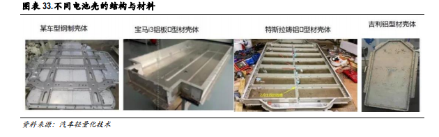 电池盒市场空间增量超过百亿。按照材料来看,电池盒主要有钢板、铝板(包括压铸、挤压等)、复合材料(碳纤维等)等几种形式,目前应用较多的是钢制、铝制。传统的燃油车主要以钢制车身为主,整车企业对钢铁的研究及技术的应用较为熟悉,所以电池包箱体开始是钢制件。随着续航里程要求推动轻量化需求提升,铝合金产品使用越来越多。