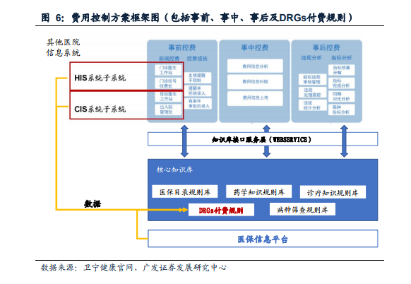 DRGs系统需要与医疗机构内部 HIS 系统、病案系统、收费系统和医保结算系统互联互通,且可根据需要开发用于同 DRG 分组器进行数据交互的接口。另一方面,上文提到DRGs分组需要HIS系统、医保系统的多维度数据,相关系统的功能、数据维度逐步全面,将提升DRGs分组的颗粒度,使得应用效果进一步提升。这个角度来看,DRGs分组付费的推广,将倒推医院、医保、相关部门提出更高的信息化建设要求。